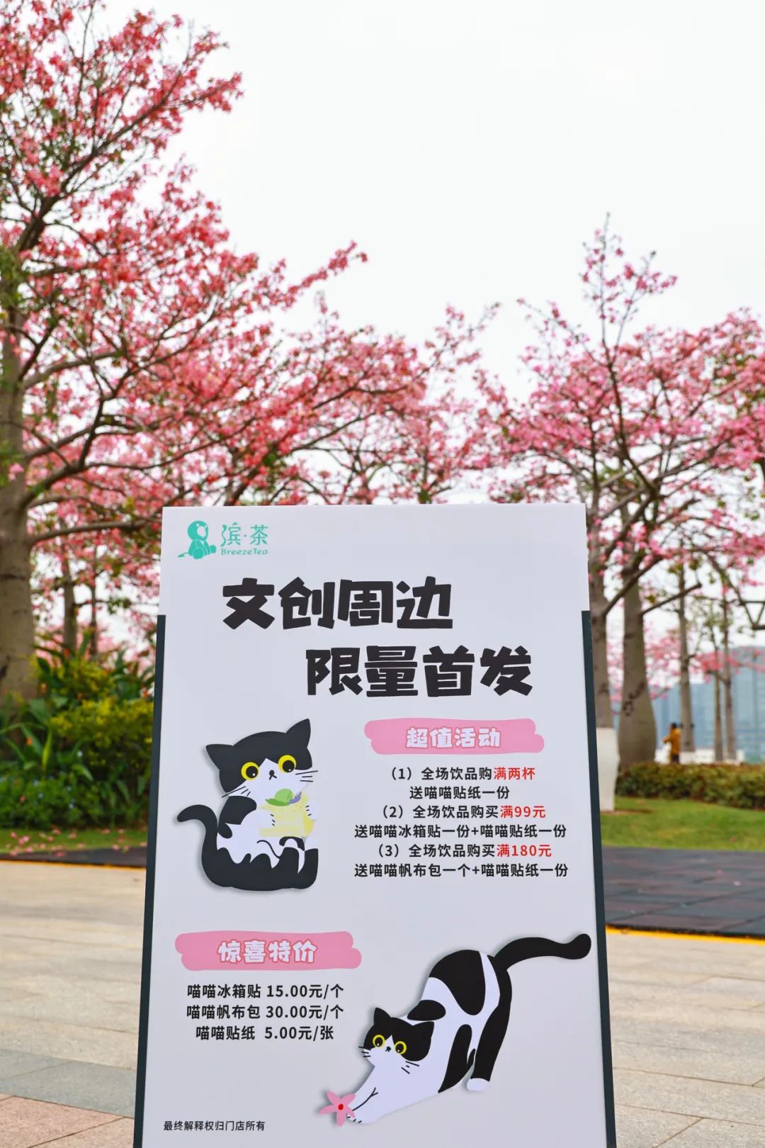 驛站自主品牌“濱·茶”更是與澳門高校學(xué)生設(shè)計(jì)工作室合作,聯(lián)手打造“貓店長(zhǎng)”花期限定主題文創(chuàng),用萌寵為花海注入更多靈氣,讓游客在被大自然治愈之余,也享受到小動(dòng)物帶來(lái)的舒心。